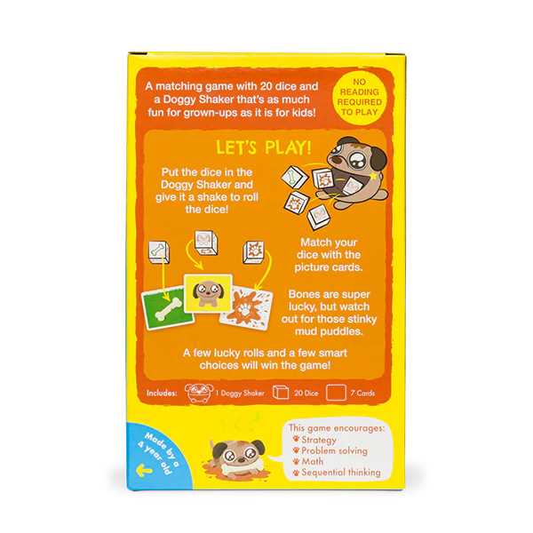 Shake up boring game nights with this dice game that’s fun for the whole family.Put the dice in the Doggy Shaker –he spits it out when you’re ready! Match the dice with the corresponding picture cards. Bones are super lucky, but watch out for those stinky mud puddles! The first player to get rid of all their dice wins. With a few lucky rolls and a few smart choices, you could be the Stinker that ends up on top! This is a great way to introduce kids to critical thinking and decision-making with a little side of math. It’s also fun for Big Stinkers